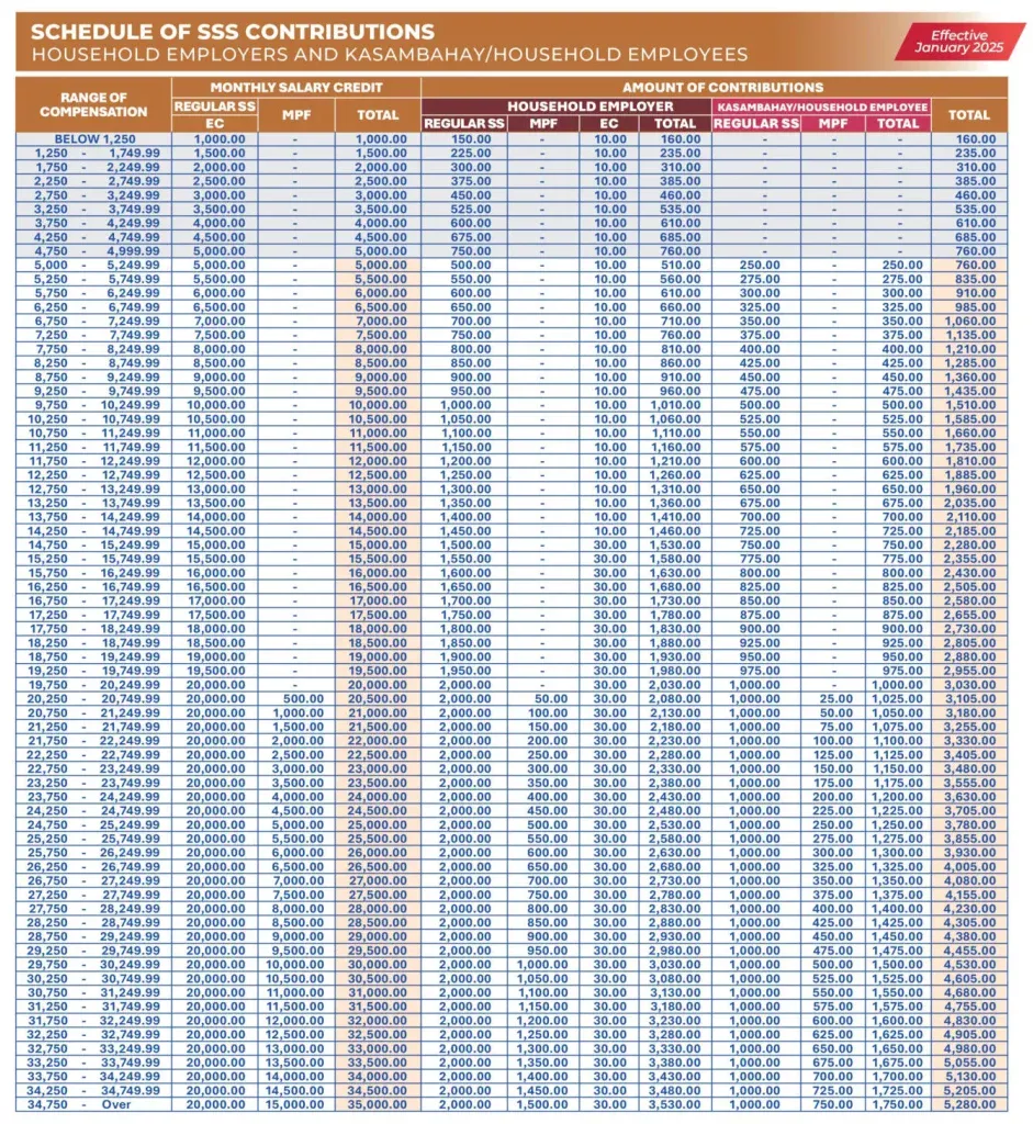 The following table outlines the updated contribution rates for household employers and kasambahay, effective January 2025: